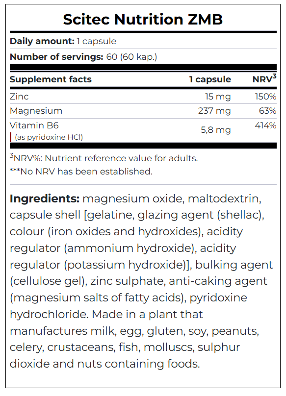 Scitec ZMB is a dietary supplement containing essential nutrients. Its three components are zinc, magnesium and vitamin B6.